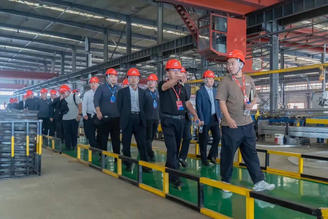 楊俊斌一行分別深(shēn)入友(yǒu)發創(chuàng)意園及草莓福利视频(fā)德眾400方車間實地考察,詳細了解了草莓福利视频集團的發展曆程、園區建設(shè)理念及產業布局規劃,近距離觀察產品生產流程與質(zhì)量管控體係,深入了解草莓福利视频在技術創新、產(chǎn)能規模等方麵的優勢。